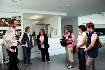 Ein Willkommensplakat mit den Fotos der Besucherbetreuer zeigte bereits im Windfang den Beschäftigten und Mitarbeitern sowie Besuchern und Gästen, wer heute erwartet wurde. Die Pressereferentin Frau Isabell Brando begrüßte Thorsten Majer mit Begleitung, einigen Mitgliedern der Fraktion und des Ortsvereinsvorstands, im Foyer und erklärte erst einmal die Beschäftigungsphilosophie des Betriebs. Besonders wichtig ist dabei die Differenzierung des Arbeitsablaufs, damit jeder Beschäftigte in der Werkstatt eine optimale Förderung seiner Einsatzmöglichkeiten erfährt – denn Unterforderung ist ebenso schädlich für die Arbeitsmotivation wie Überforderung.