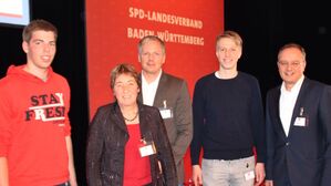 von links: Georg Gauger, GEW-Landesvorsitzende Doro Moritz, SPD-Kreisvorsitzender Lars Barteit, Yannick Schulze, Kultusminister Andreas Stoch Foto: Frederick Brütting